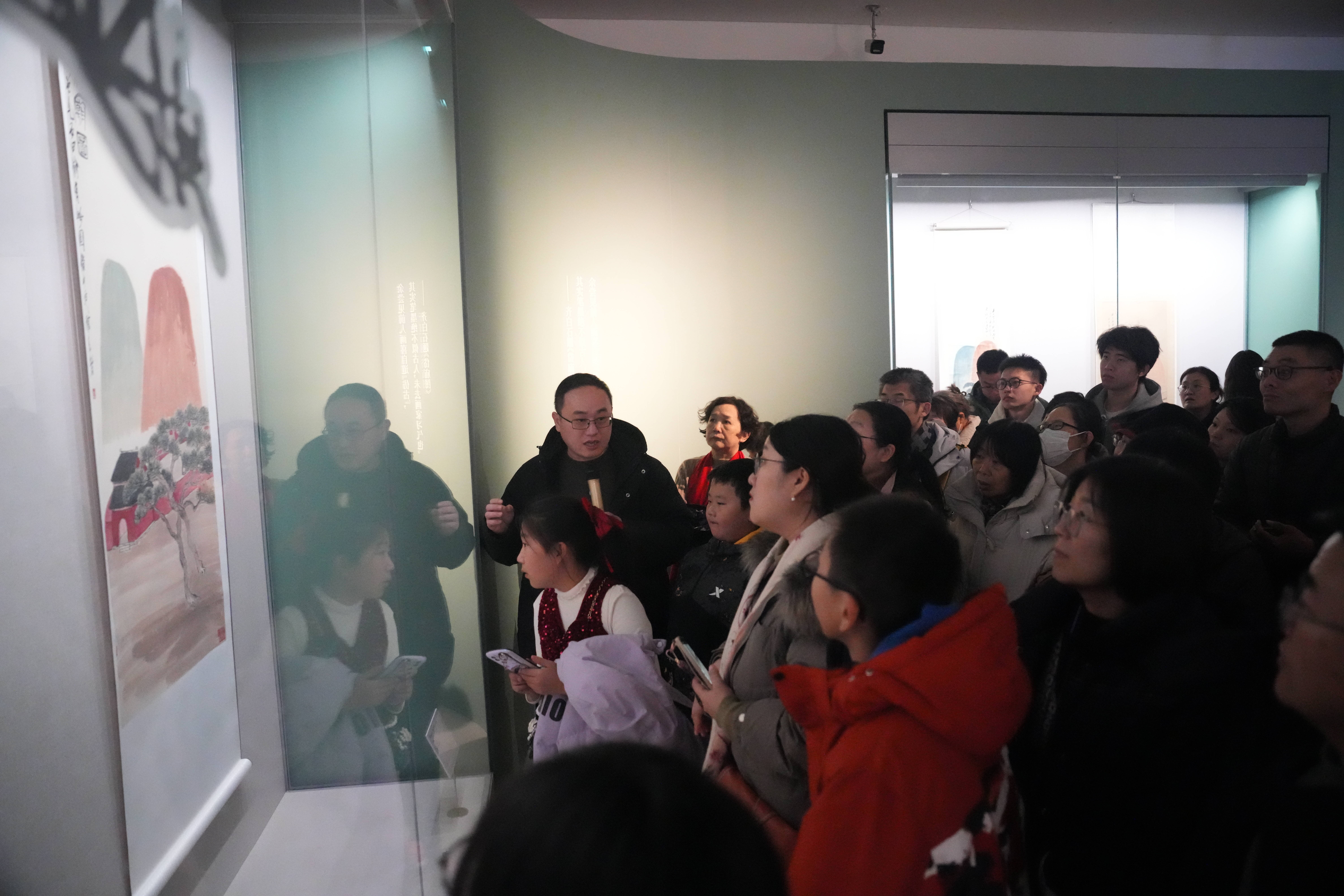 作为跨年主角之一的“学我者生——齐白石与山东弟子”特展,自2025年12月22日开展以来,便成为泉城文化焦点,汇集全国6省7市、11家重要机构的136件珍贵藏品,系统梳理了齐派艺术在齐鲁大地的传承脉络。跨年夜,观众们穿行于“古今可师”“我行我道”“白石门下”三大单元,在齐白石及其弟子李苦禅、王雪涛、于非闇、许麟庐、崔子范等人的真迹前驻足品鉴,感受跨越时空的艺术对话。